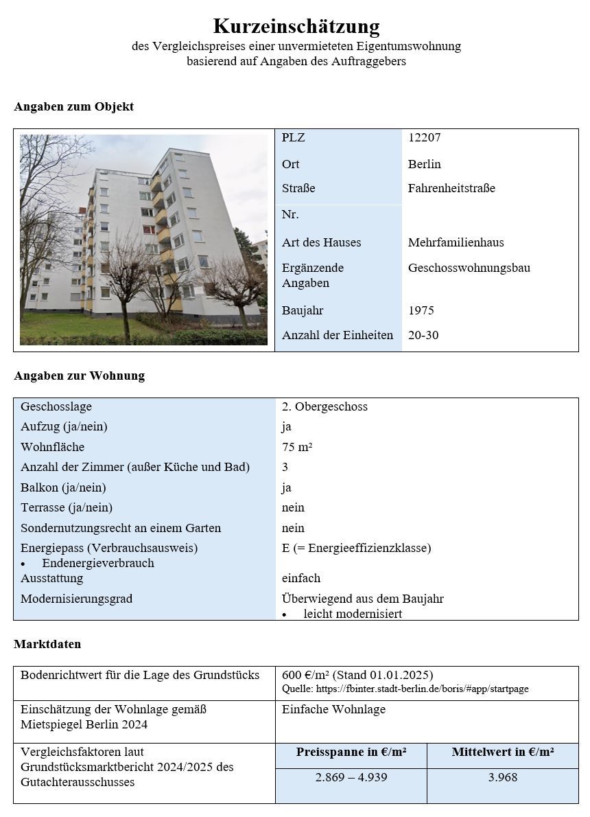 - Die Kurzeinschätzung basiert auf den Angaben des Auftraggebers, eine Objektbesichtigung durch den Gutachter erfolgt nicht.